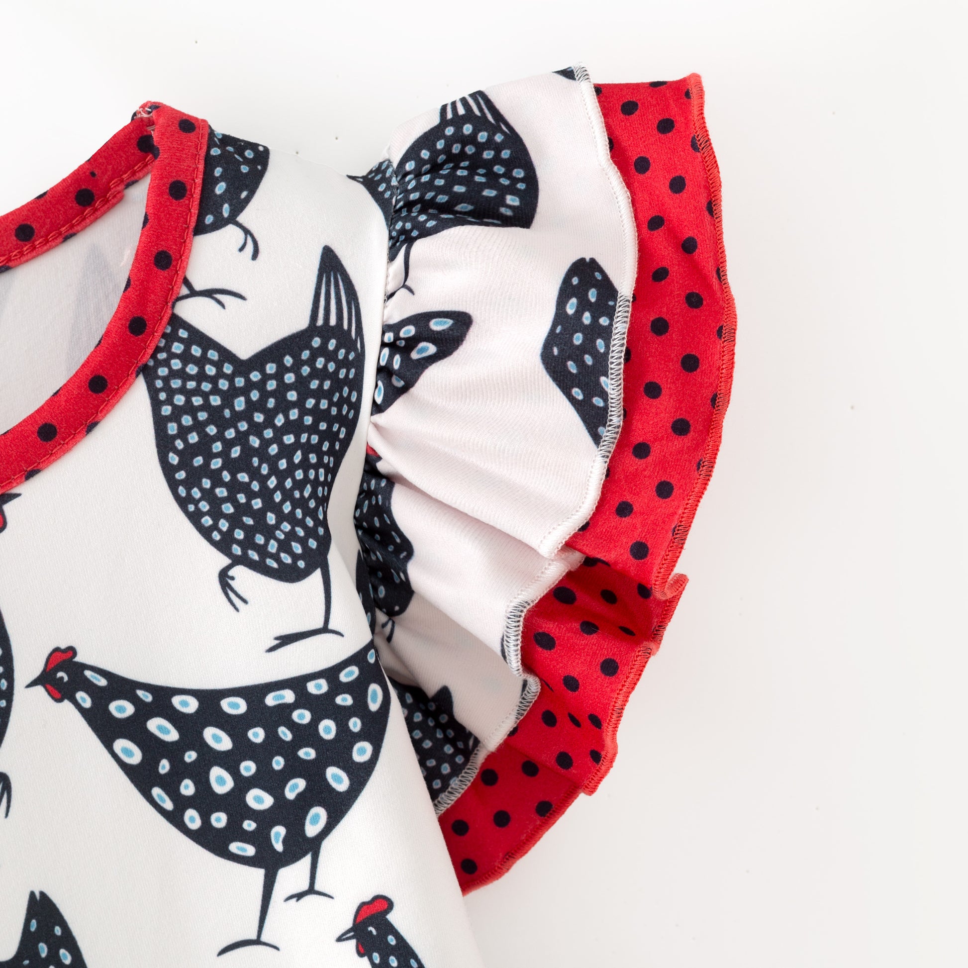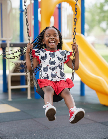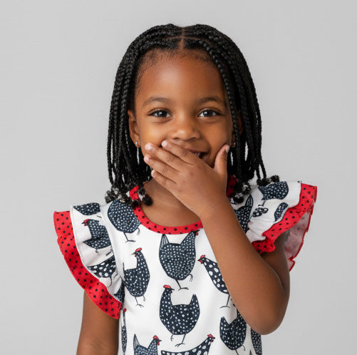Meet the top that'll have everyone clucking with delight! This Double Flutter Sleeve beauty features a bold, eye-catching chicken pattern that's impossible to miss. With playful ruffled sleeves and vibrant colors, it's the perfect pick for kids who love making a statement. Whether she's heading to school or playtime, this fun top brings personality and charm to every outfit.