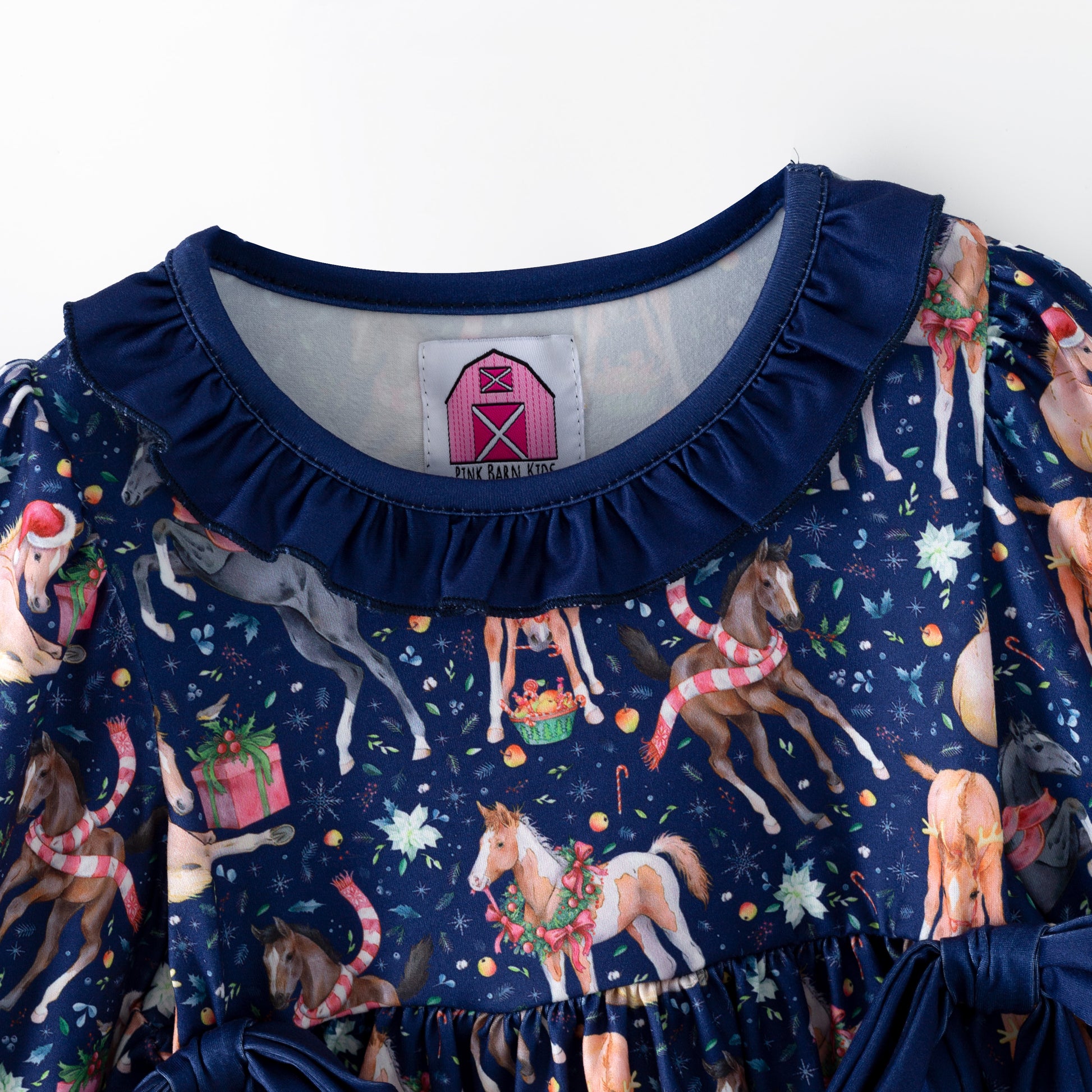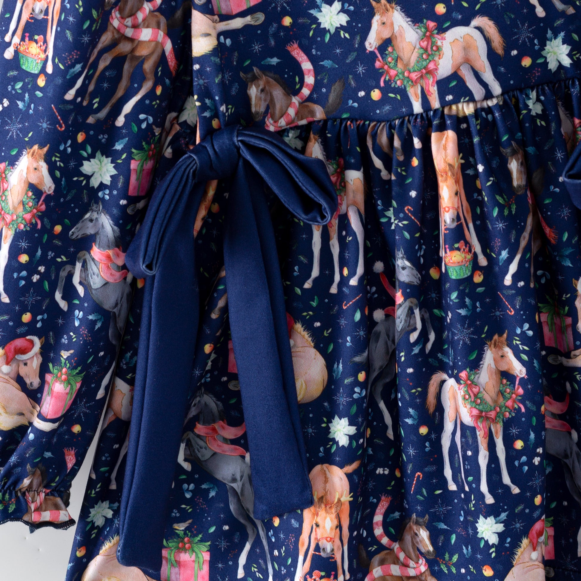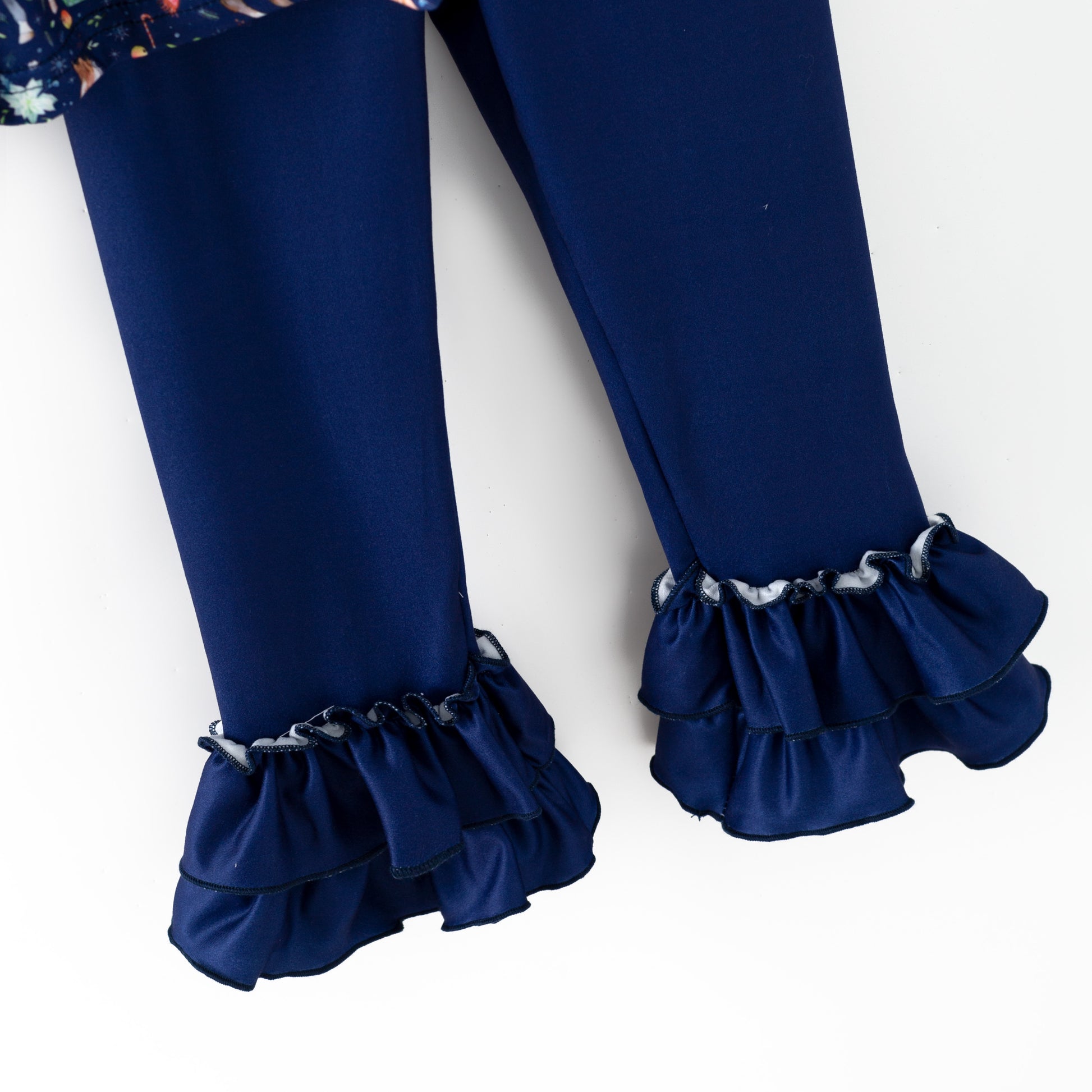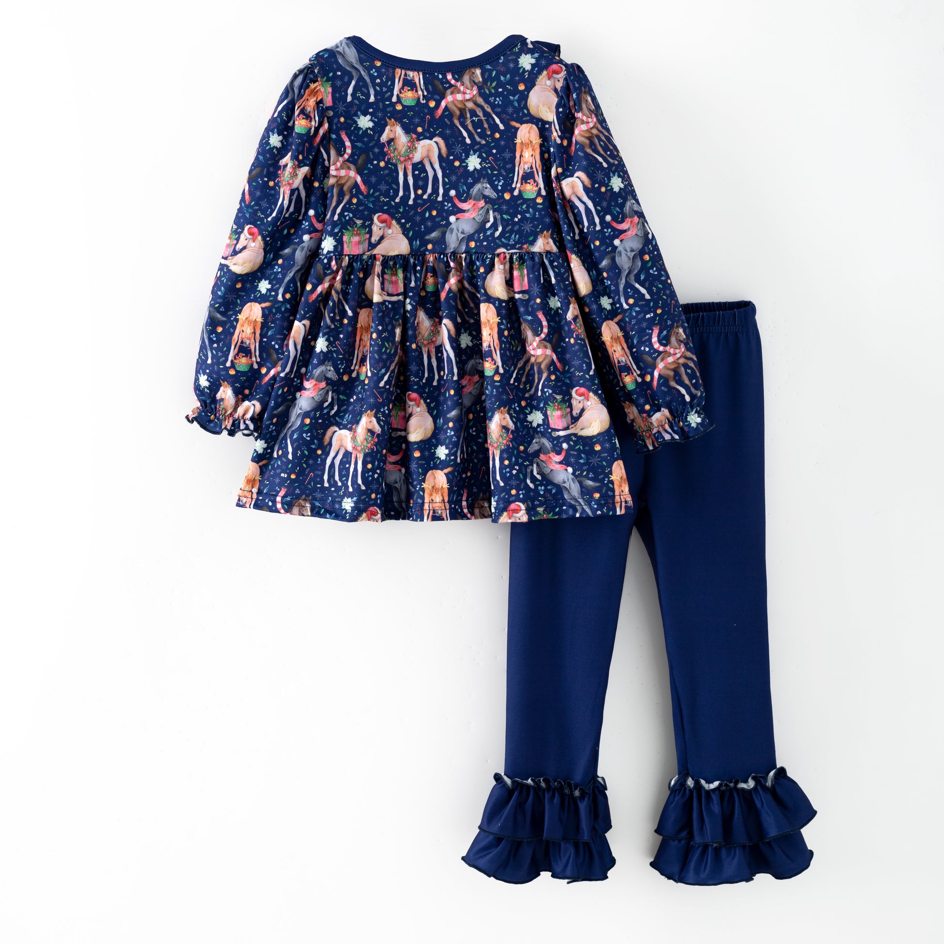 Saddle up for holiday magic! This cheerful Christmas Horse 2-Piece Set features prancing ponies adorned with festive wreaths in a whimsical print that'll delight any young equestrian. Perfect for girls who dream of horses, this playful design captures the joy of the season with every gallop. Cozy and fun, it's the gift every pony-loving kid has been hoping for. The blue leggings feature double ruffles around the ankles for a girly touch.